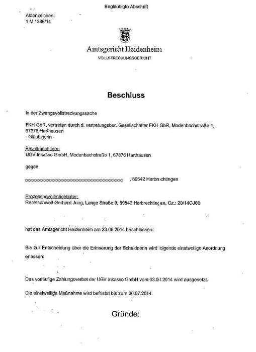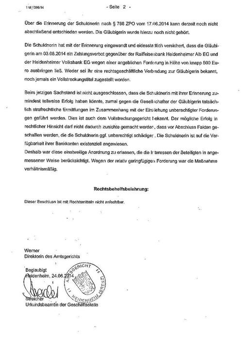 Diese - zunächst nur vorläufige - Entscheidung ist mit Rechtsmitteln nicht mehr anfechtbar. Das Inkassounternehmen hat also keine Möglichkeit, die Pfändungs-wirkung wiederherzustellen. Ebensowenig hat allerdings auch der angebliche Schuldner eine Rechtsbehelfsmöglichkeit gegen einen eventuell ablehnenden Gerichtsbeschluß. Der Erfolg dieser Maßnahme hängt also wesentlich davon ab, daß der Antrag von vorneherein so hieb- und stichfest begründet wird, daß das Gericht ihm auch stattgibt.